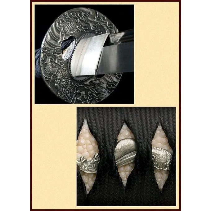 Dieses katana ist vollständig handgeschmiedet und hat eine rasierklingenscharf Klinge. Das Schwert wiegt nur 1237 g und hat eine Länge von 104 cm mit einem Griff von 28 cm und eine Klinge von 75 cm mit einer Dicke von 7 mm. Die Katanas besteht aus 1055 Kohlenstoffstahl.