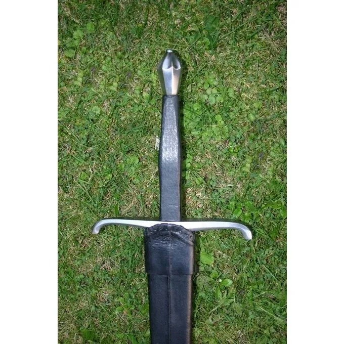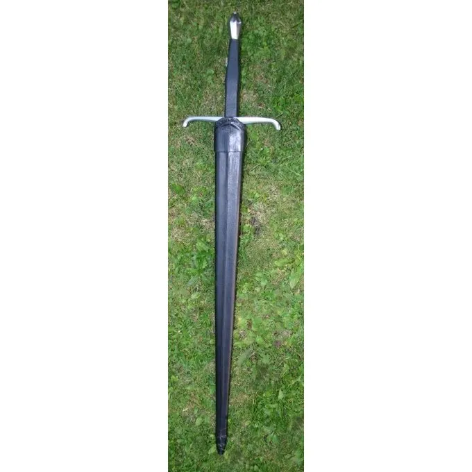 Das Schwert ist 119 cm lang und hat eine Klingenlänge von 90 cm. Die bsemi-Schärf Klinge aus Kohlenstoffstahl mit einer Rockwell-Härte von 48-50 HRC. Die gelieferte Holz Scheide ist mit Leder bezogen.