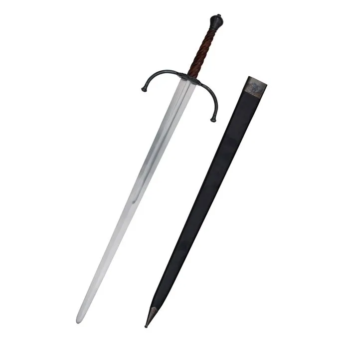 Dieses schöne Schwert basiert auf Originalen aus dem 14. und 15. Jahrhundert. Diese zweihändige Art von Schwert wurde auch als Langschwert oder Bastardschwert bezeichnet. Das Schwert hat einen eleganten Holzgriff, der spiralförmig verläuft. Das Holz wird traditionell geschliffen und poliert. Ein besonderes Detail ist, dass das spiralförmige Muster auch auf dem Knauf zu sehen ist, aber in umgekehrter Reihenfolge bildet dies einen schönen optischen Kontrast. Die Wache hat einen verdrehten Parierring. Das Schwert wird inklusive einer Lederscheide mit Holzkern geliefert. Die Scheide hat Stahlspangen.