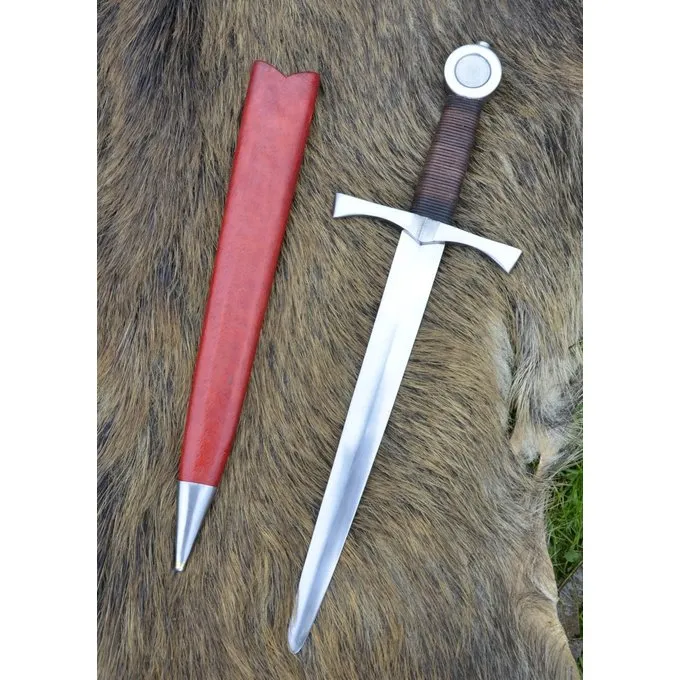 Diese Art von kurzem Dolch war sehr beliebt im Mittelalter, die beide mit Rittern, als sekundäre Waffe, und mit gemeinen Soldaten, Pikeniere und Bogenschützen. Dieses Modell wurde im 14. und 15. Jahrhundert verwendet. Der Dolch hat eine Klinge aus gehärtetem Federstahl und ist stumpf. Es ist für den Lichtschwertkampf geeignet. Der Dolch ist mit Scheide geliefert. Die rote Lederscheide Abdeckung gibt es einen zusätzlichen Luxus Aussehen.