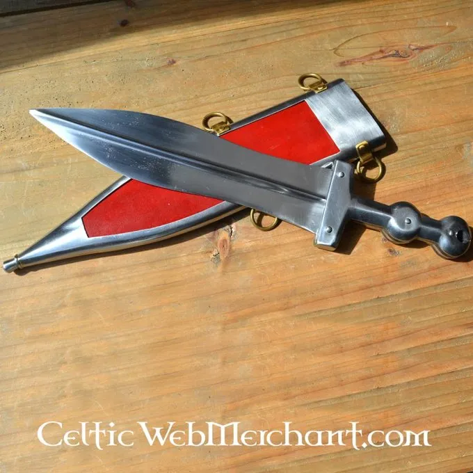Diese pugio ist 38 cm lang, mit einer Klinge von 25 cm lang. Es wiegt 1 kg. es besteht aus Kohlenstoffstahl hergestellt, mit einer Scheide aus Stahl und Holz