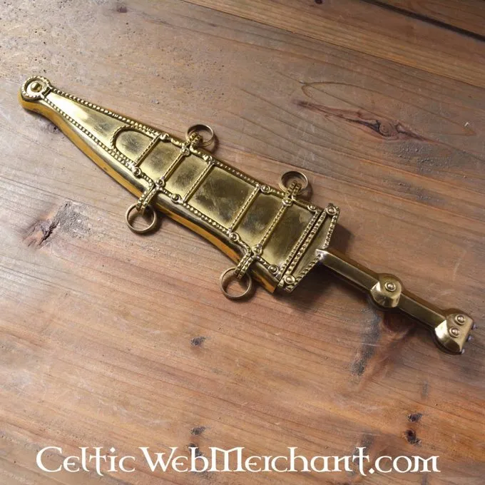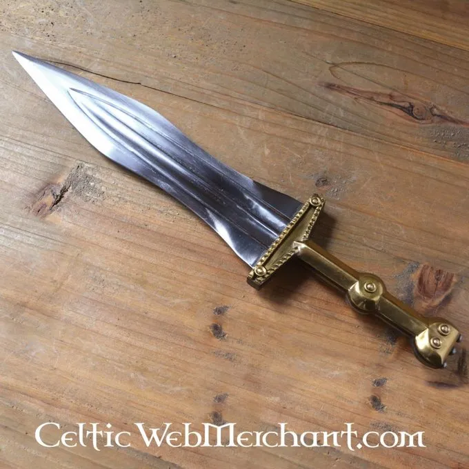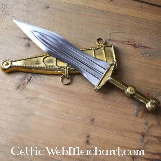 Dieser Dolch 33,5 cm lang, mit einer Klinge von 22,5 cm lang und 5,2 cm breit. Die Scheide und Griff des pugio sind aus Messing