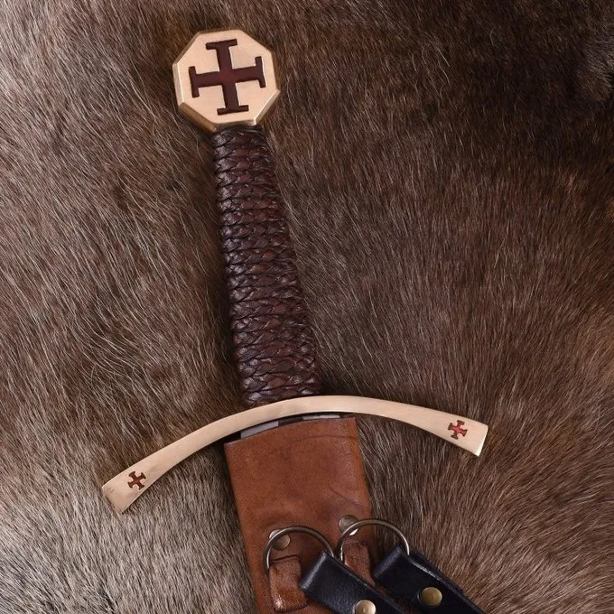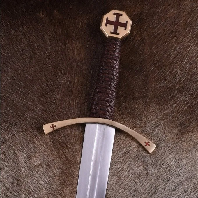 Dieses dekorative templar Schwert hat eine Klinge aus Karbonstahl mit einem volleren. Der Griff ist aus Holz und mit geflochtenem Leder. Das Schwert hat eine massive Parierstange und einen achteckigen Knauf aus Messing. Sowohl die Parierstange und der Knauf sind mit rot lackierten Kreuzen geschmückt. Das Schwert ist mit einer passenden Scheide geliefert. </ P>