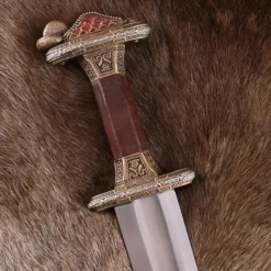 Dieses Replik Schwert ist ein schönes Stück für Ihr Schwert Sammlung. Es wurde nach einem Schwert aus einem Schiffsgrab in der Nähe von Uppsala, Schweden ausgegraben hat. Wegen der Fülle und die Handwerkskunst des Schwert symbolisiert, es gehörte mit ziemlicher Sicherheit zu einem Chef, edel oder Elite-Krieger. Die Vendelzeit fand zwischen dem Great Migrations und der Wikingerzeit. Mehr dieser reich verzierten Schwerter wurden in der Vendel Periode gefunden. Diese Replik ist aus EN45 Federstahl gefertigt und verfügt über eine breite voller. Der Griff ist aus Messing und das gesamte Heft zeigt schöner Dekorationen im Vendel Stil. Der Knauf besteht aus Cloisonné mit roten Emaille. Das Schwert ist mit einer braunen Lederscheide mit Messingschmuck geliefert.