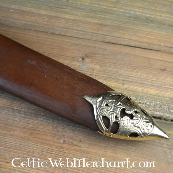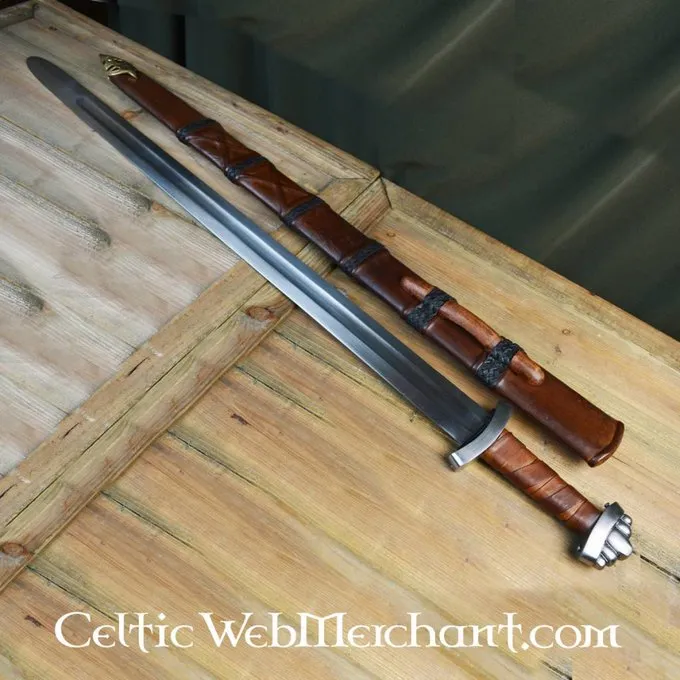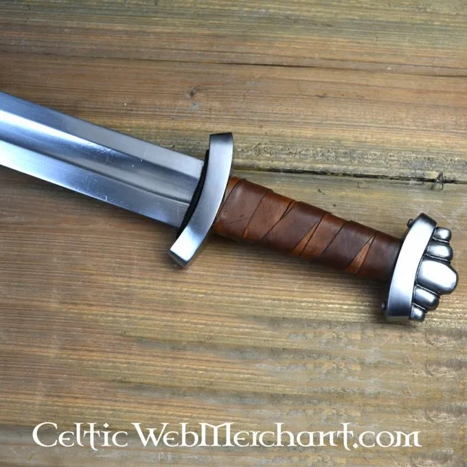 Dieses Wikingerschwert ist eine Nachbildung eines in England ausgegrabenen Originals aus dem 10. Jahrhundert. Solche Schwerter wurden um das 10. Jahrhundert in ganz Nordeuropa eingesetzt. Dieses Schwert hat einen fünflappigen Knauf, dies kam öfter vor als bei sieben geliebten Pommels. Lappen waren oft durch Stahldraht voneinander getrennt.