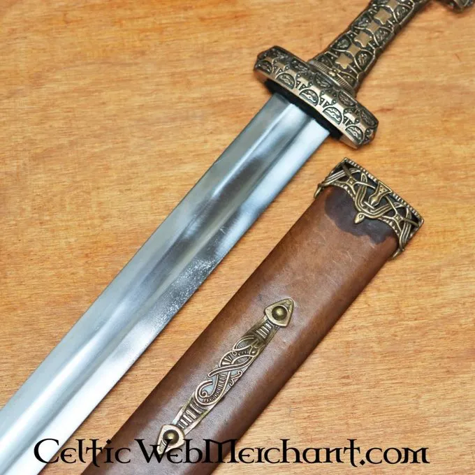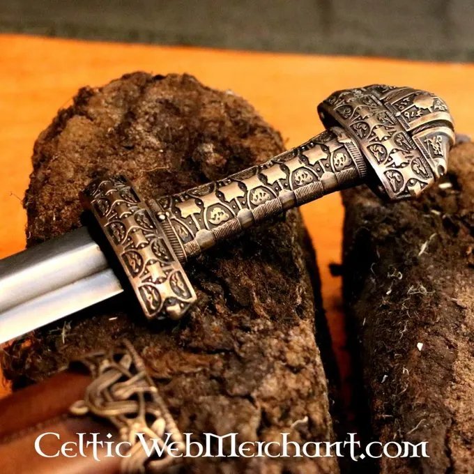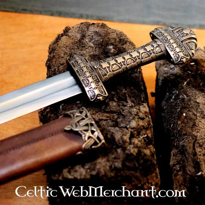 Dieses Wikingerschwert ist ein Nachbau eines Originals aus dem 9. bis 10. Jahrhundert auf der Insel Eigg, Schottland gefunden. Die Inseln der Hebriden waren eine wichtige Basis der Wikinger und waren bis ins 12. Jahrhundert ein Teil des Königreichs Norwegen auf. Die nordischen Wikinger gemischt mit der gälischen Bevölkerung. Das luxuriöse Schwert ist nicht eindeutig. Ähnliche dekorierten Schwerter wurden überall auf dem Viking Bereich. Dieses Wikingerschwert hat eine dünne Klinge mit einer breiten Hohlkehle. Die Parierstange und Griff sind aus Bronze gefertigt und reich verziert. Das Schwert ist mit Scheide geliefert.