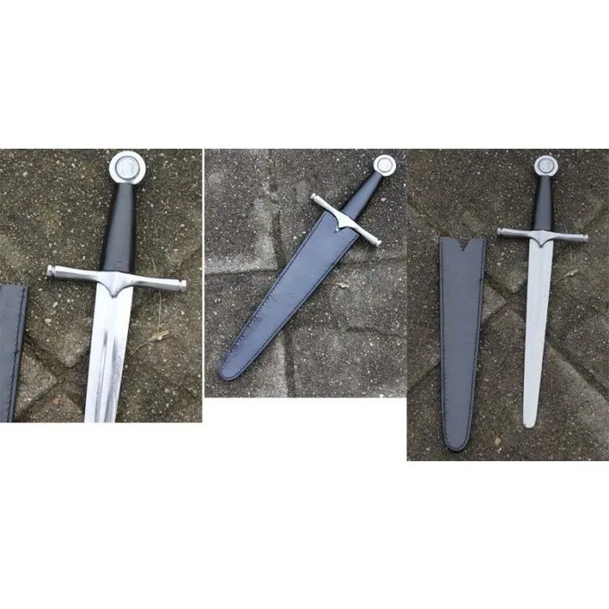 Produktdetails: Länge: 44 cm / Klingenlänge: 31 cm / Grifflänge: 13 cm / Gewicht: 650 g / Stahltyp: EN45 Kohlenstoffstahl Härte 48 HRC. / Schneide: 3 mm (Kampf-ready) / Tang-Konstruktion: Voll Tang-Konstruktion / Knauf: geschraubt / Griff: Holz, Leder / A