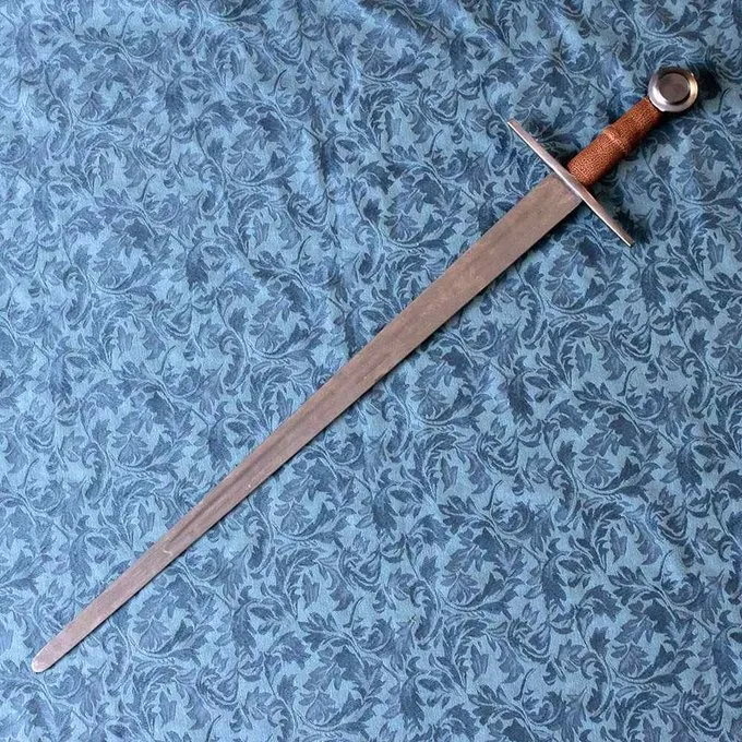 Dieses schattierende Schwert wird für die Nachstellung gemacht. Solche Schwerter wurden seit dem frühen 12. Jahrhundert von den Rittern verwendet. Der Griff besteht aus Hartholz und die Lederverpackung hat eine zusätzliche Verdickung, so dass er gut in der Hand liegt. Die Klinge besteht aus 54 SICR6 -Kohlenstoffstahl mit einer Härte von 50 Stunden. Der Tipp ist für zusätzliche Sicherheit abgestumpft.