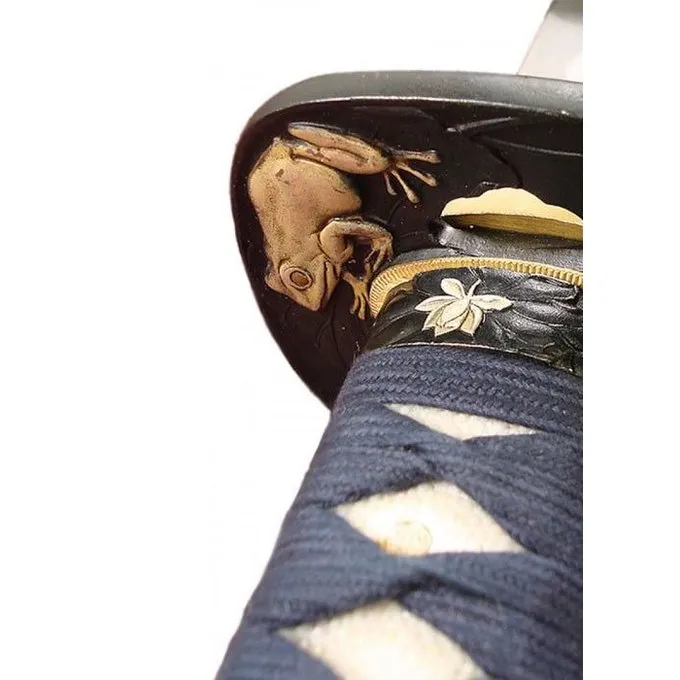 Die Klinge dieses katana hat eine mittlere Länge und ist in dem kissaki Stil. Es besteht aus K120C Stahl. Die Saya ist mit schwarzem Lack lackiert und die tsuka ist mit einer hohen Qualität und Hand derselben vorgesehen. Der tsuka-ito ist aus dunkelblauer japanischer Baumwolle. Die Tsuba ist aus blauem Eisen gefertigt und bemalt Gold und Silber mit einem Frosch und Lilien. Der Frosch läuft an sageo durch die eleganten dunkelblau und dunkelgrünen Farben hat. Dieses katana ist komplett handgefertigt, so dass jeder katana ist in seinem eigenen einem einzigartigen Meisterwerk.