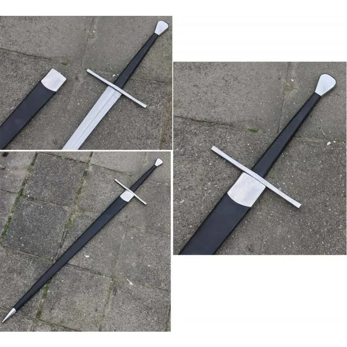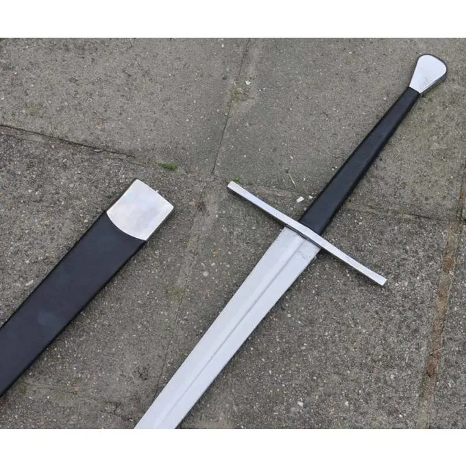 Dieses Anderthalbhänder bietet eine gute Kombination von Gewicht und Kraft. Es hat eine kurze und tiefe Hohlkehle das Schwert leichter und besser ausgeglichen zu machen. Anderthalbhänder wie diese waren vor allem beliebt im 15. Jahrhundert. Es hat einen Typ T (Duft Stopper) Knauf, die vor allem in Deutschland verwendet wurde.