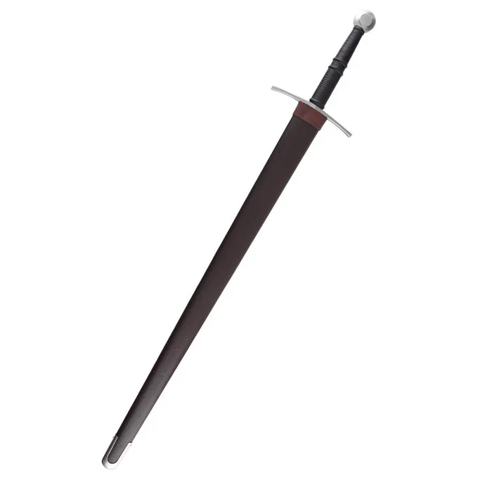 Dieses Hand-and-Hall-Sword basiert auf Schwertern, die um das 13. – 14. Jahrhundert eingesetzt wurden. Um diese Zeit herrschte der Körperschutz hauptsächlich aus Leder, Gambeon und Kettenmail. Es war die Zeit, als Plattenrüstung sein Erscheinungsbild machte. Dieses Schwert wurde von Gus-Trim für Kingston-Arme entwickelt. Der Knauf und der Kreuzguard bestehen aus Edelstahl. Dieses Schwert wird geliefert, einschließlich eines mit Leder bedeckten Holzscheiben. Der Knauf wird peened, was bedeutet, dass die Tang-Konstruktion durch den Knauf geht und nach oben genietet wird.