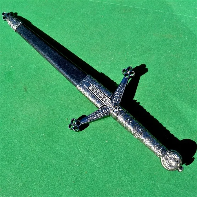 Dieses mittelalterliche Kurzschwert wurde oft während eines Duells verwendet. Schwerter wie diese konnten dünne Teile der Rüstung zu durchdringen mit ihrer scharfen Spitze. Dieses kurze Schwert ist im Stil der schottischen Claymores aus dem 15. Jahrhundert mit seinen typischen Waben Motiven an dem Enden des Parierstange komplett aus. Der Griff und Teile der Scheide sind reich mit Gravuren verziert. Es wird geliefert mit einer Scheide und seine Länge beträgt 52 cm.