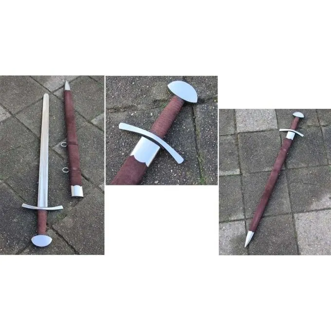 Produktdetails: Länge: 92 cm / Klingenlänge: 75 cm / Schutz Breite: 18 cm / Gewicht: 1350 g / Stahltyp: EN45 Kohlenstoffstahl 48 HRC / Schneide: Blunt (3 mm kampfbereit) / Tang-Konstruktion: Voll Tang-Konstruktion Knauf /: Screwed / Griffwicklung: Holz, L