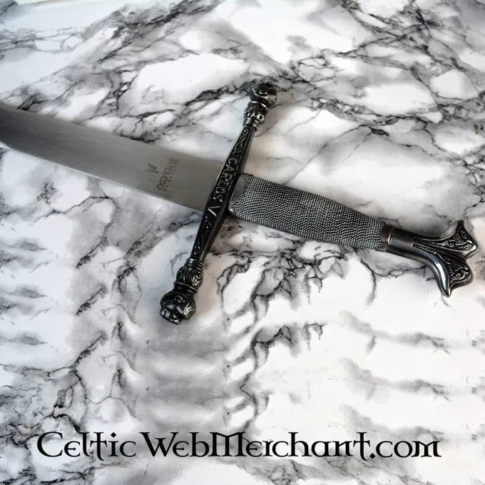 Produktdetails: Länge: 100 cm / Klingenlänge: 59 cm / Grifflänge: 16 cm / Gewicht: 1000 g / Stahlsorte: Edelstahl / Schneide: Halbscharf / Erlkonstruktion: Vollerlkonstruktion / Knauf: Geschraubt / Griffwicklung : Stahl / Basierend auf einem historischen