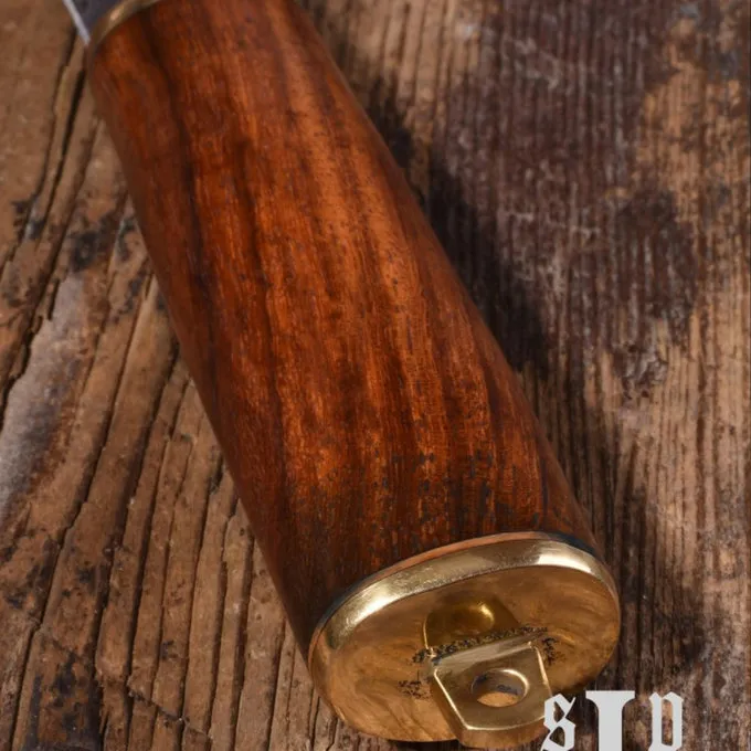 Material: Damaszenerstahl (256 Lagen), Holz, Messing, Leder / / Länge: 27 cm / / Rand: scharf (für den praktischen Gebrauch) / / Klingenlänge: 14 cm / / Lieferung inklusive Lederscheide / / Ungefähres Gewicht. 160 g (380 g inkl. Scheide) / / Auf der Grund