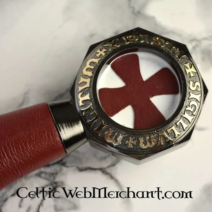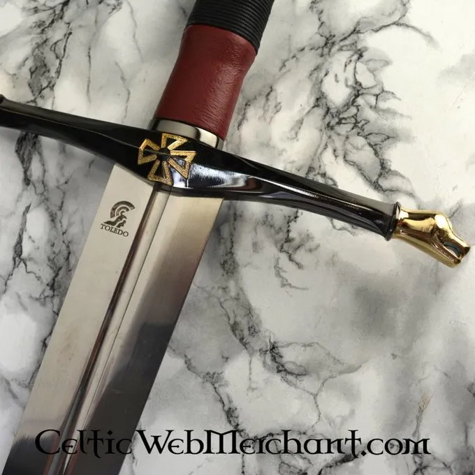 Dieser Tempelritter Schwert von Toledo Stahl. Seine Länge beträgt 107 cm und ist reich verziert. Es hat eine schöne offene Knauf, dass ihm ein leistungsfähiges, aber elegantes Aussehen verleiht. Die Enden der Parierstangen Löwenköpfen.