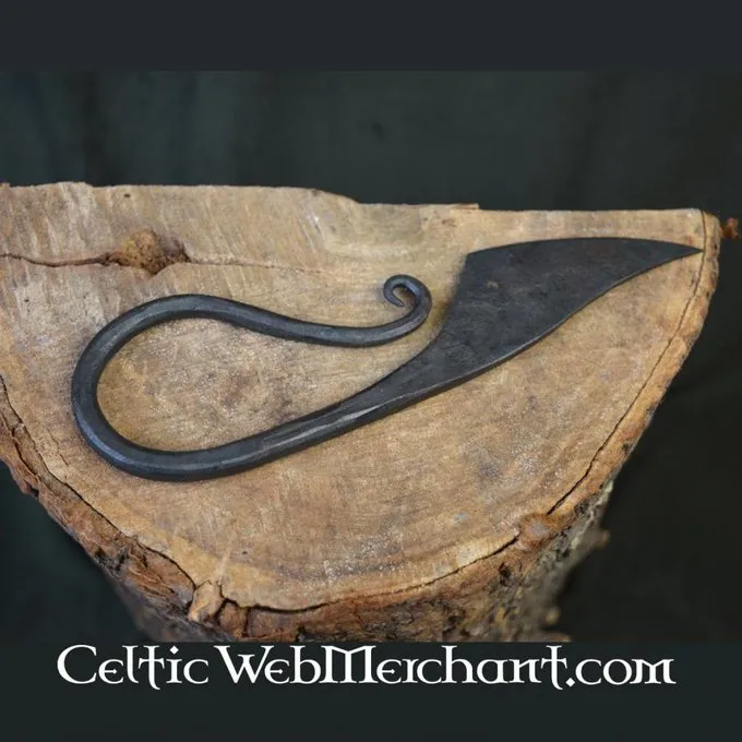 Die Locke am Ende des Griffs verleiht dem Messer eine typische Erscheinung. Das Messer ist aus Kohlenstoffstahl handgeschmiedeten, hat es einen Griff von 6 cm und seine Gesamtlänge beträgt 15 cm.
