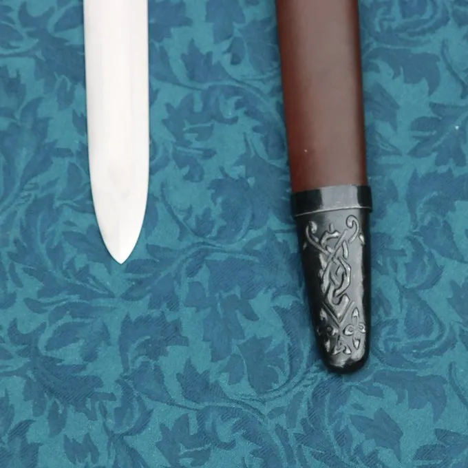 Dieses Replik Schwert basiert auf historische Schwerter aus dem neunten Jahrhundert, die Wikingerzeit. Die Wikinger hoch Stärke und Macht angesehen, im frühen Mittelalter die Wikinger plünderten Klöster und andere Orte des Reichtums wie Lindisfarne. Zur gleichen Zeit waren die Wikinger auch Bauern, vor allem Opportunisten, die in schwierigen und kalten Gebieten leben mussten und waren immer für eine bessere Orte zum Leben suchen. Das neunte Jahrhundert war auch das Jahrhundert, in dem dänischen Wikinger ihr Glück in England gesucht. In 871 kämpfte sie einen großen Kampf gegen Prinz Alfred, der später als Alfred bekannt, dass der Große, der die Armee von König Ethelred von Wessex geführt. Die Wikinger verloren diesen Kampf, aber für den Rest des Jahrhunderts sie zu diesem besonderen Land zu erobern Teile davon zurückkommen würden. Dieses Schwert hat einen schönen segmentierte Griff mit braunem Leder, ein typischen Viking Pauschen und Parierstange mit Knoten Motiven aus der Viking-Kunst. Der Knauf und Wächter sind patiniert, so dass es wie ein echtes antikes altes Schwert aussieht. Das Schwert hat eine lange, breite voller, so dass es ganz leicht ist und eine ausgezeichnete Balance. Es fühlt sich angenehm in der Hand. Es wird mit einer sehr luxuriösen Scheide mit Messingscheide Spitze und einem Schwert Gürtel geliefert, so dass Sie es um Ihre Taille hängen. Die halb scharfe Klinge ist aus 1065 Kohlenstoffstahl geschmiedet und mit einer Härte von 48-52 HRC temperiert. Dieses Schwert ist ein schönes Schwert für die Wand in Ihrer eigenen Viking Halle und ideal für Ihr Viking Kostüm oder Cosplay von Wikingern oder Last Königreich. Wenn Sie die Klinge blunten, ist es eine perfekte Schwert für Schwertkampf, historischen europäischen Kampfsport und Viking Nachstellung Schlachten.